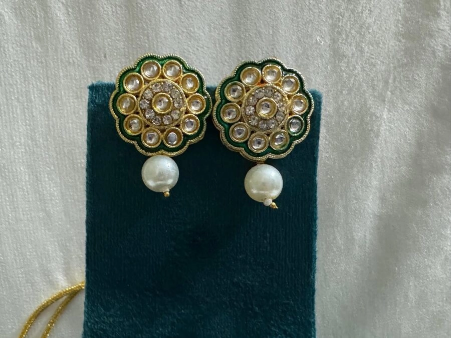 – Stones: Green gemstones with pearl accents