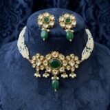 Embrace the essence of traditional elegance with this exquisite pearl and green stone choker set. This stunning piece features a beautifully designed choker necklace adorned with lustrous pearls and rich green stones, accentuated by intricate gold detailing. The set comes with matching earrings that echo the choker’s floral motif, bringing a cohesive and sophisticated look to your ensemble.