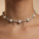 This elegant jewelry set features a timeless combination of white pearls and sparkling halo accents, crafted in a polished silver-toned alloy. The choker is designed with evenly spaced pearls, each encircled by a delicate frame of clear stones that add brilliance and definition. Suspended from a fine chain with an adjustable clasp, the necklace offers flexibility in length, making it suitable for varied necklines and styling preferences.