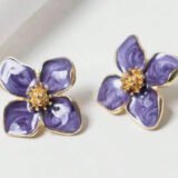 Celebrate artistry and elegance with these handcrafted floral earrings, designed to evoke the charm of a blooming garden. Each earring features a four-petal flower in rich marbled purple, accented with delicate white veining and bordered in radiant gold. The center glows with a golden stamen detail, adding warmth and depth to the design.