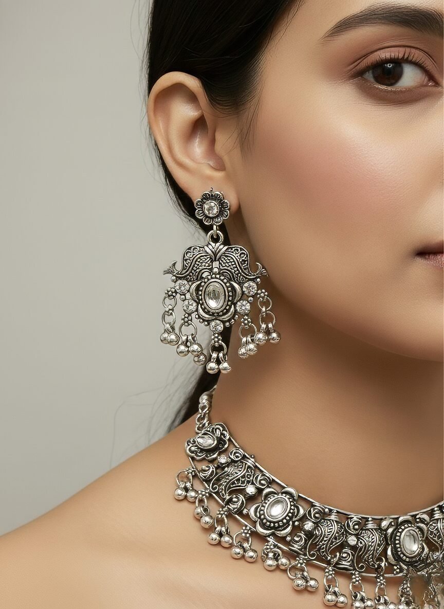This ornate jewelry ensemble captures the essence of traditional Indian artistry with a bold, regal presence. The choker necklace, crafted in oxidized silver, features intricate patterns and embedded stones, enhanced by delicate dangling beads that add movement and grace. Complementing the necklace, the large jhumka-style earrings showcase elaborate detailing and cascading beads, creating a striking silhouette that frames the face beautifully.