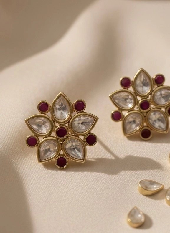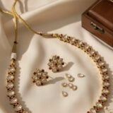 The necklace features a graceful pattern of teardrop stones that reflect light beautifully, interspersed with vivid red embellishments that add depth and contrast. The earrings are designed in a floral motif arranged in a circular bloom, bordered with red stones for a regal touch.