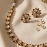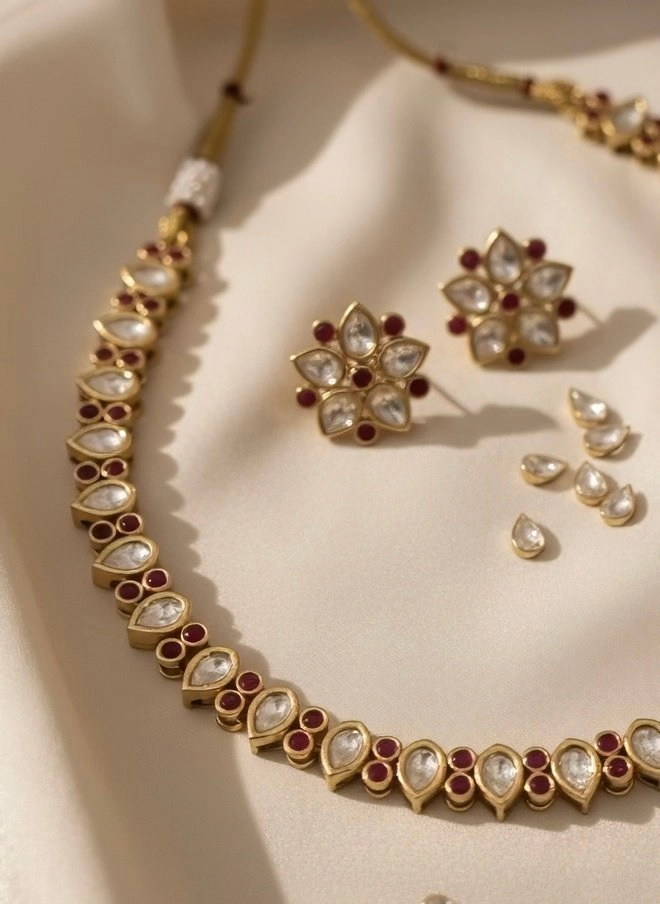 This traditional Kundan jewelry set showcases timeless elegance through its intricate craftsmanship and rich design elements. The set includes a necklace and matching earrings, each meticulously arranged with alternating teardrop-shaped white stones and small round red accents, all set in a radiant gold-toned base.