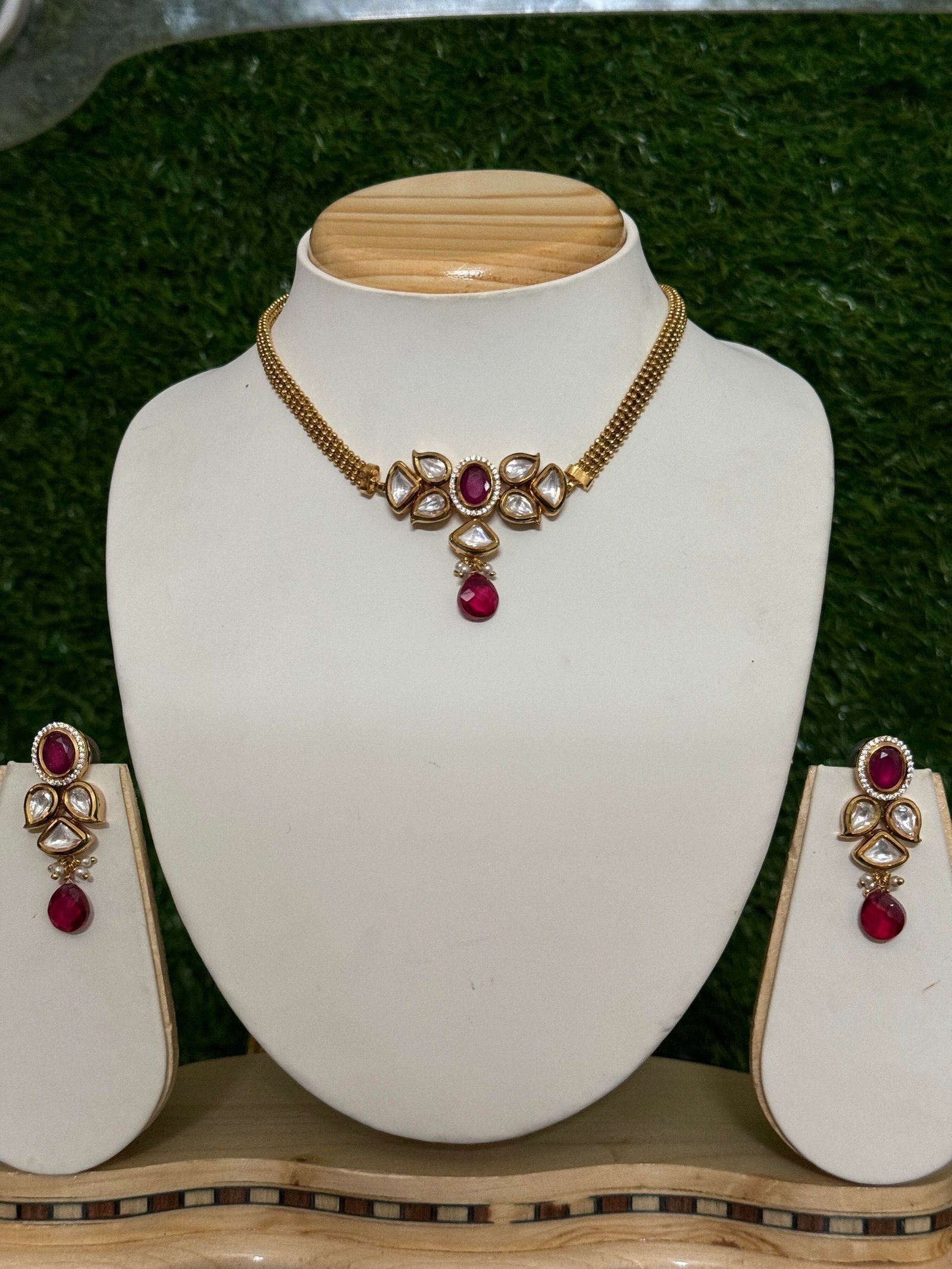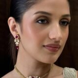 – Earrings Design: The earrings mirror the choker’s design, featuring a harmonious blend of kundan stones and a central red gemstone. The drop design adds a subtle movement and grace to the earrings, creating a perfect match to the choker.