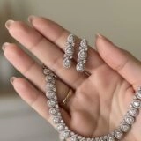 This jewelry set comprises a single-layer necklace adorned with pearl-shaped diamond CZ stones, elevating its elegance and sophistication. The matching earrings beautifully complement the necklace design, rendering it an ideal accessory