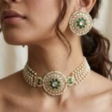 Elevate your style with our Royal Emerald Kundan Choker Set, a true masterpiece that blends timeless tradition with modern elegance. The centerpieces of this set are the exquisite emerald-hued Kundan stones, framed by a meticulously crafted arrangement of pearls and golden accents. This choker’s classic circular design offers a bold, yet elegant look, while the matching oversized earrings add a touch of grandeur. The choker’s base is crafted with high-quality materials, ensuring durability without compromising on comfort, making it ideal for long wear.