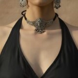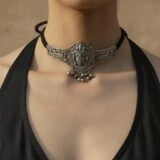 his striking jewelry set is a showcase of traditional silver craftsmanship, blending cultural artistry with bold design. The choker necklace features an ornate central medallion adorned with a carved face motif, symbolizing heritage and artisanal skill. Dangling silver beads frame the medallion, adding texture and movement to the piece.