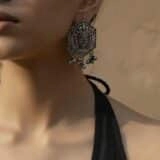 The matching earrings mirror the necklace’s artistry, each designed with a similar face motif and bead embellishments that create a cohesive ensemble. The intricate detailing and oxidized silver finish highlight the timeless appeal of handcrafted jewelry.