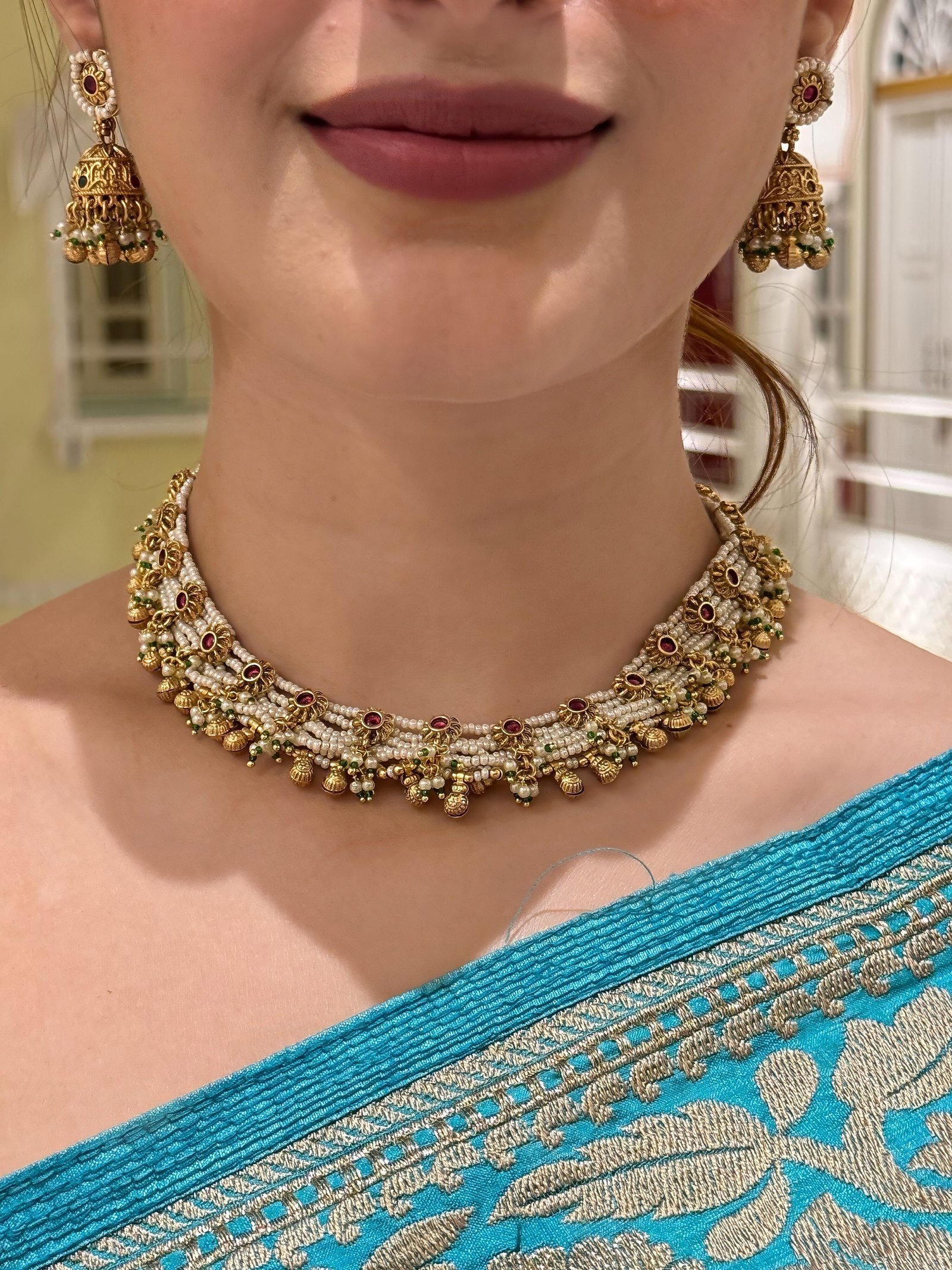 Matching jhumkas with intricate detailing, featuring a harmonious mix of pearls and golden embellishments to complete the set. - Premium Craftsmanship: