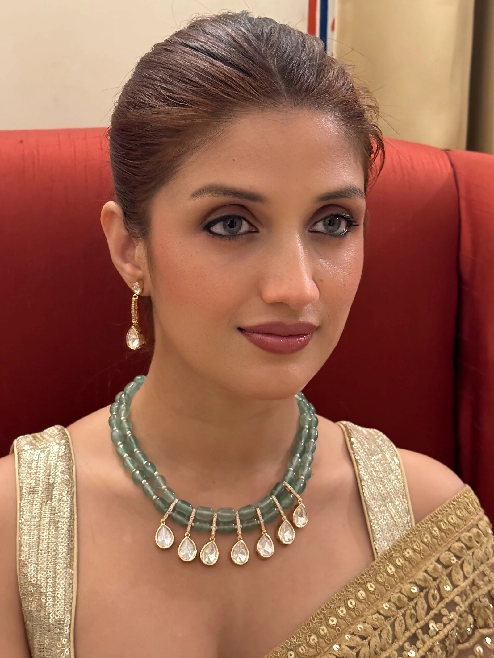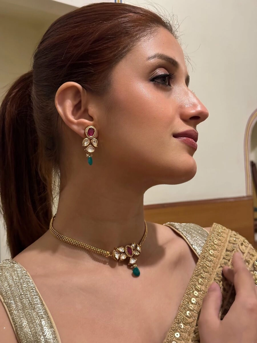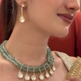 Enhance the beauty of this necklace by pairing it with an embroidered pastel saree, a shimmering organza outfit, or a light-toned Anarkali for a graceful traditional look. For contemporary events, style it with a satin gown in neutral shades like beige, mint green, or champagne. Keep your makeup soft and glowing with peachy tones and a hint of shimmer. A sleek updo or a neatly styled ponytail will showcase the necklace and earrings beautifully, ensuring all eyes are on you.”