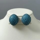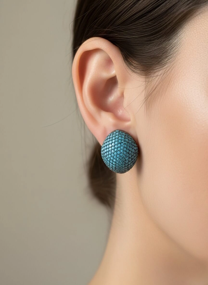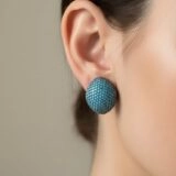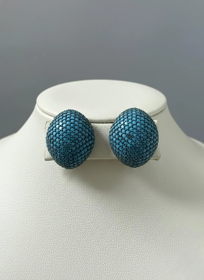 These bold earrings are a striking showcase of vibrant color and meticulous craftsmanship. Designed in a dome shape, each piece is encrusted with tightly packed turquoise-colored stones arranged in a symmetrical pattern. The vivid blue stones are set against a dark metal base, creating a dramatic contrast that enhances their brilliance.