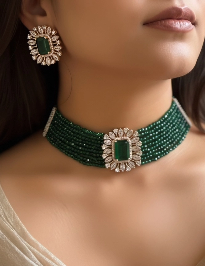 The necklace features a beautiful string of timeless, green-colored beads, each carefully chosen for their rich hue and timeless appeal. The beads are interspersed with delicate gold accents, creating a harmonious blend of colors and textures. This stunning piece features a central, large green stone that exudes elegance and sophistication and serves as a focal point of the design. Pair it with our matching earrings to complete your look and elevate your style to new heights