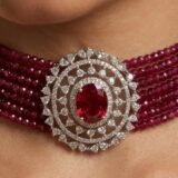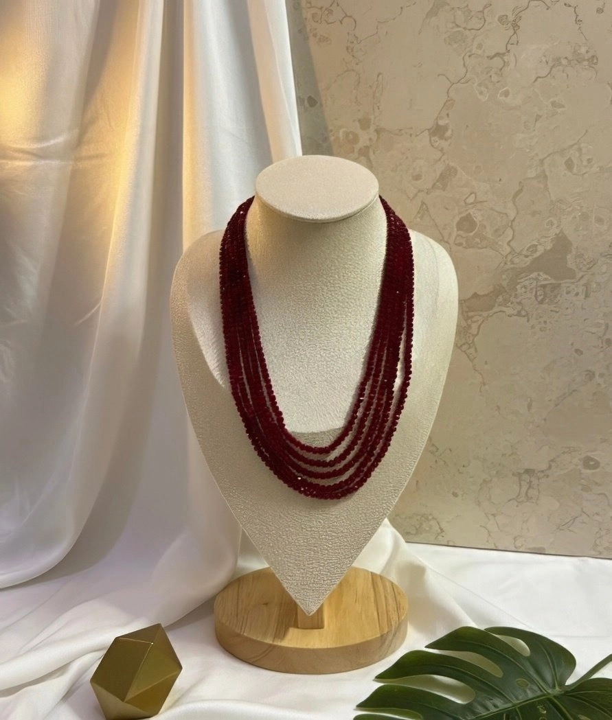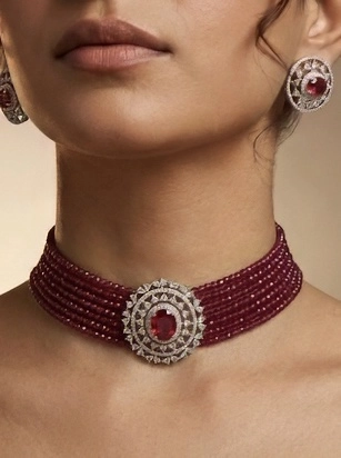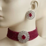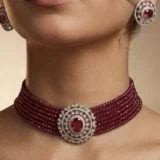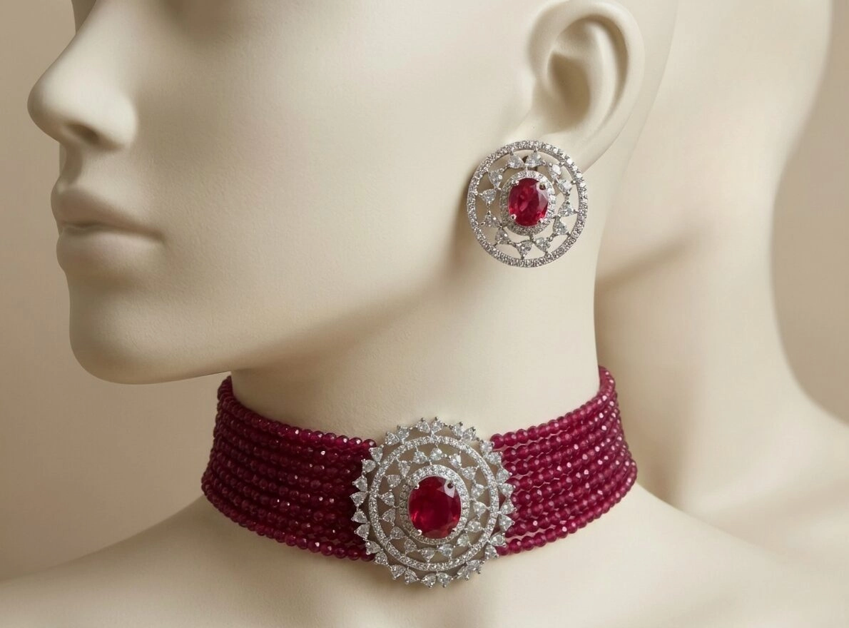 Enhance your elegance with our stunning mehroon choker featuring a captivating large mehroon stone at its center, exquisitely complemented by small diamonds on either side. Crafted with precision and style, our beaded choker is the perfect accessory to elevate any ensemble. Pair it with your favorite outfit for a touch of sophistication. Complete your look with our carefully curated collection of accessories.