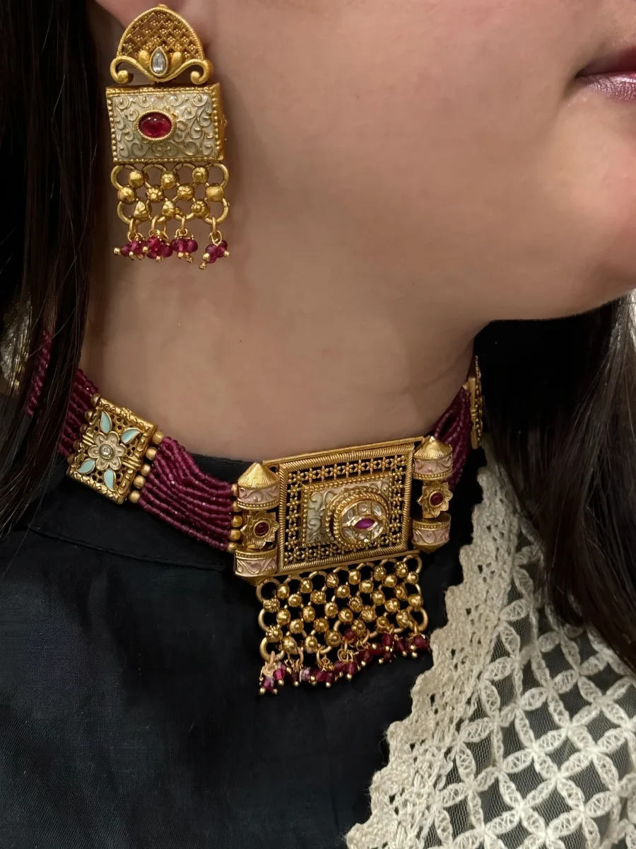 Antique Gold-Plated Temple Choker with Ruby Beads and Earrings