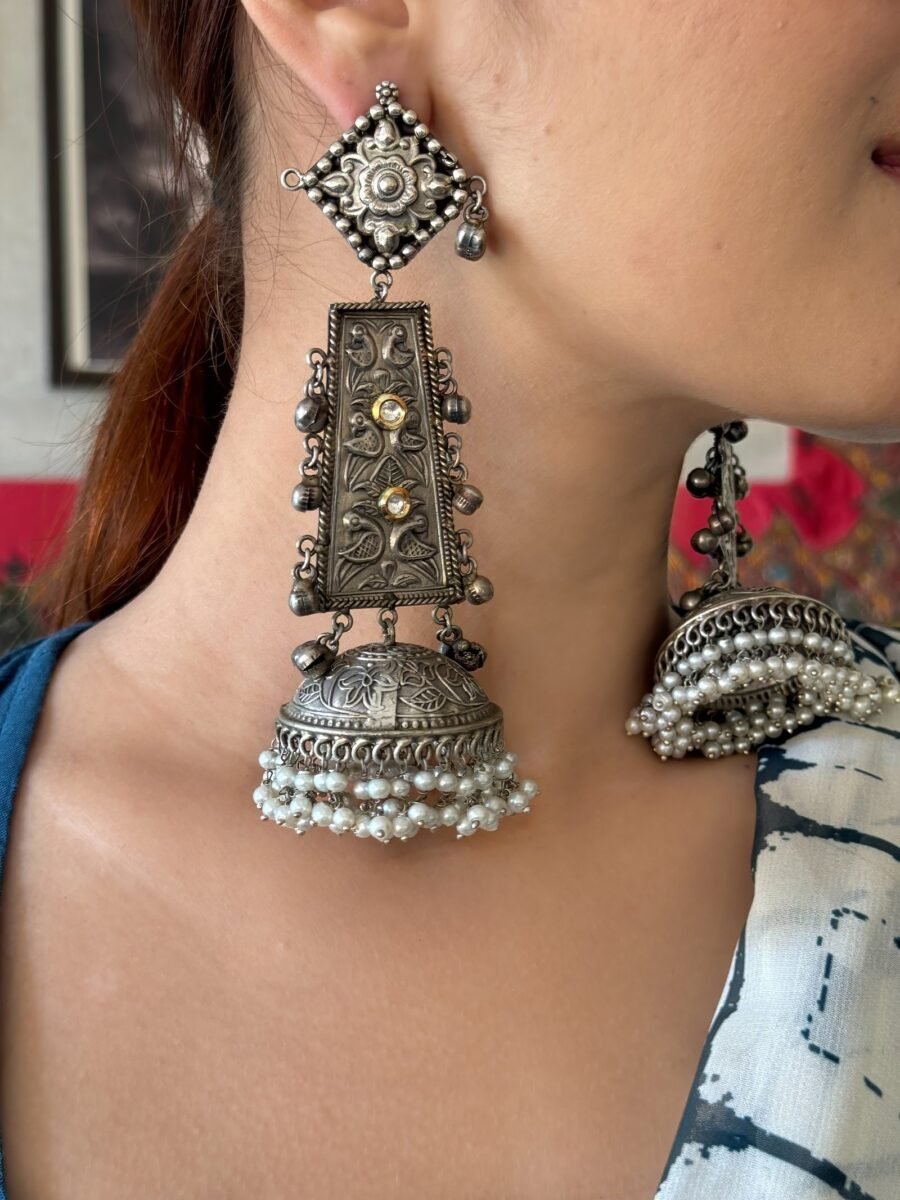 Antique Silver Dual Peacock Earrings with Pearl DanglersRated 5.00 out of 5